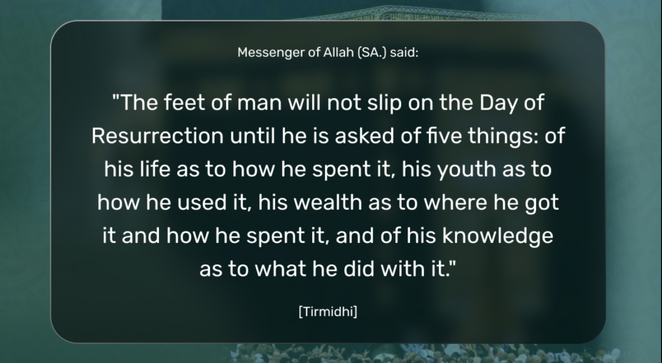 “The feet of man will not slip on the Day of Resurrection until he is asked of five things: his life, his youth, his wealth, his knowledge, and what he did with all of these.”